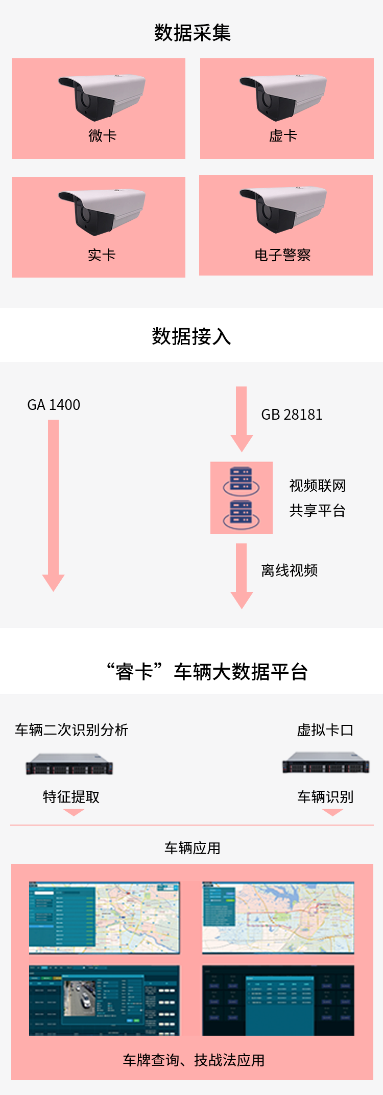 “睿卡”車輛大數(shù)據(jù)平臺(tái)是一款能夠復(fù)用城市高清治安監(jiān)控?cái)z像機(jī),利用視頻分析技術(shù)、大數(shù)據(jù)技術(shù)實(shí)現(xiàn)車輛抓拍、特征識(shí)別和車輛技戰(zhàn)法等功能的平臺(tái),為綜治、公安、城管等部門提供決策支持。